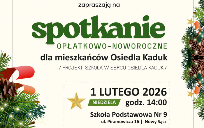 Zapraszamy mieszkańców Osiedla Kaduk do udziału w spotkaniu opłatkowo-noworocznym, organizowanym w ramach projektu "Szkoła w sercu Osiedla Kaduk".