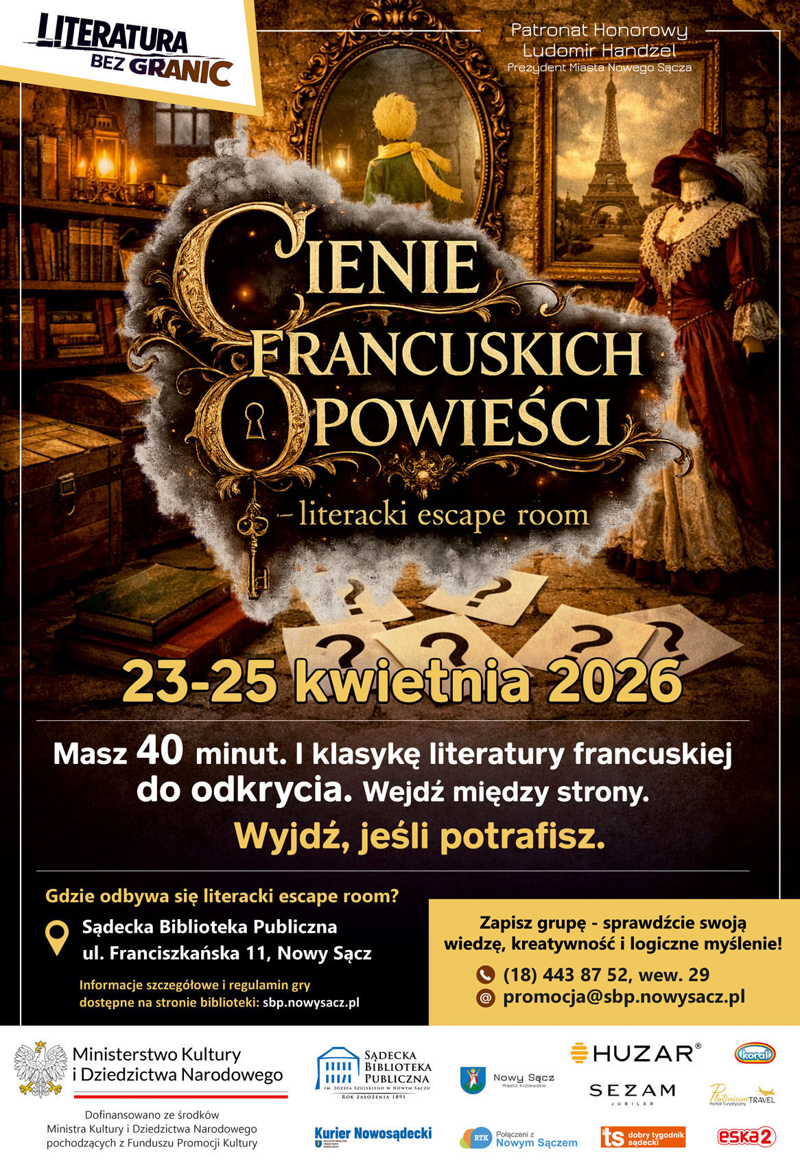 Zapraszamy do udziału w literackim escape roomie „Cienie francuskich opowieści”, który przeniesie uczestników w świat francuskiej kultury, literatury i logicznych wyzwań.