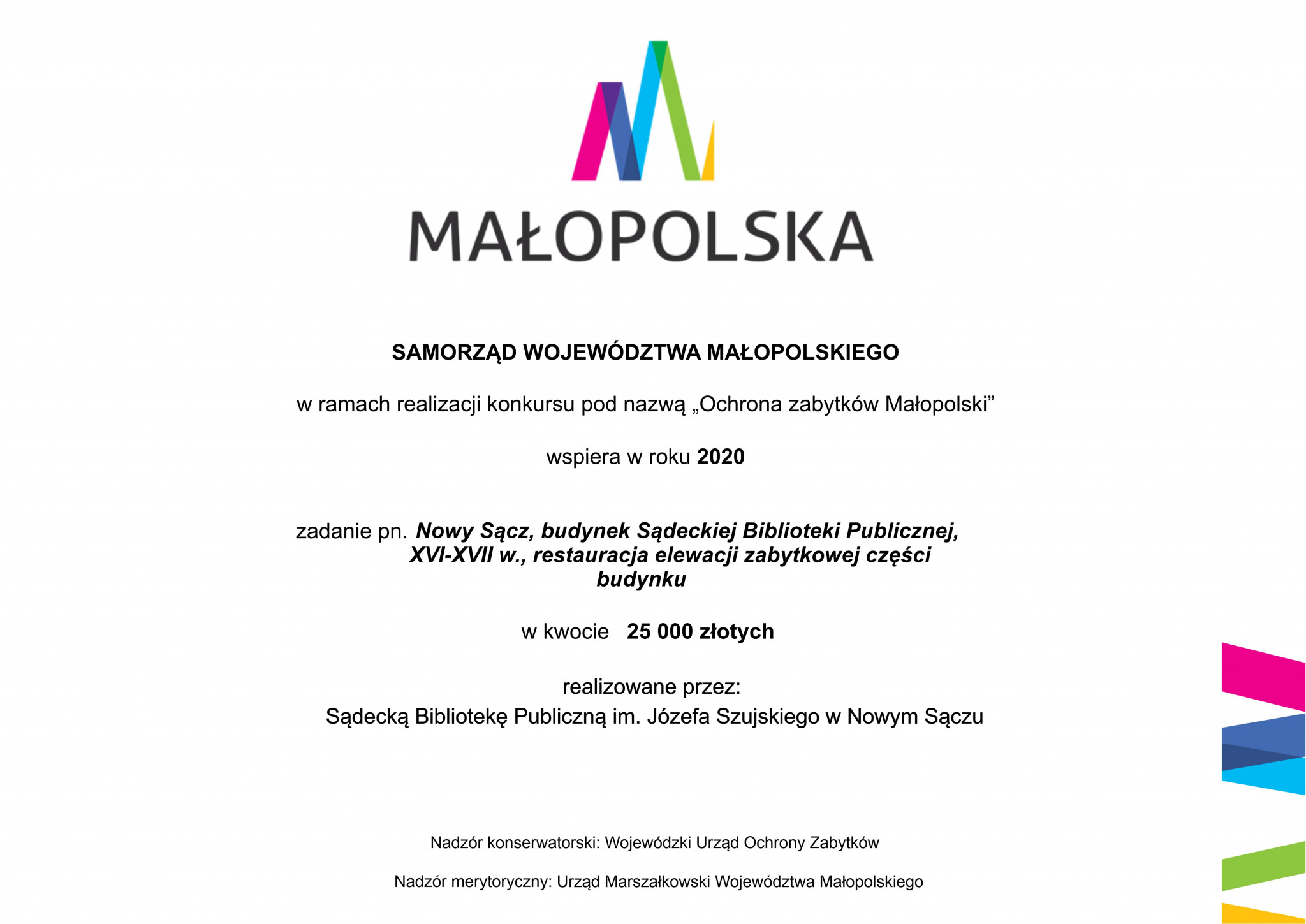 W ramach realizacji konkursu pod nazwą „Ochrona zabytków Małopolski 2020” Samorządu Województwa Małopolskiego, pragniemy poinformować, iż zrealizowaliśmy zadanie pod nazwą „Nowy Sącz, budynek Sądeckiej Biblioteki Publicznej, XVI-XVII w., restauracja elewacji zabytkowej części budynku”.