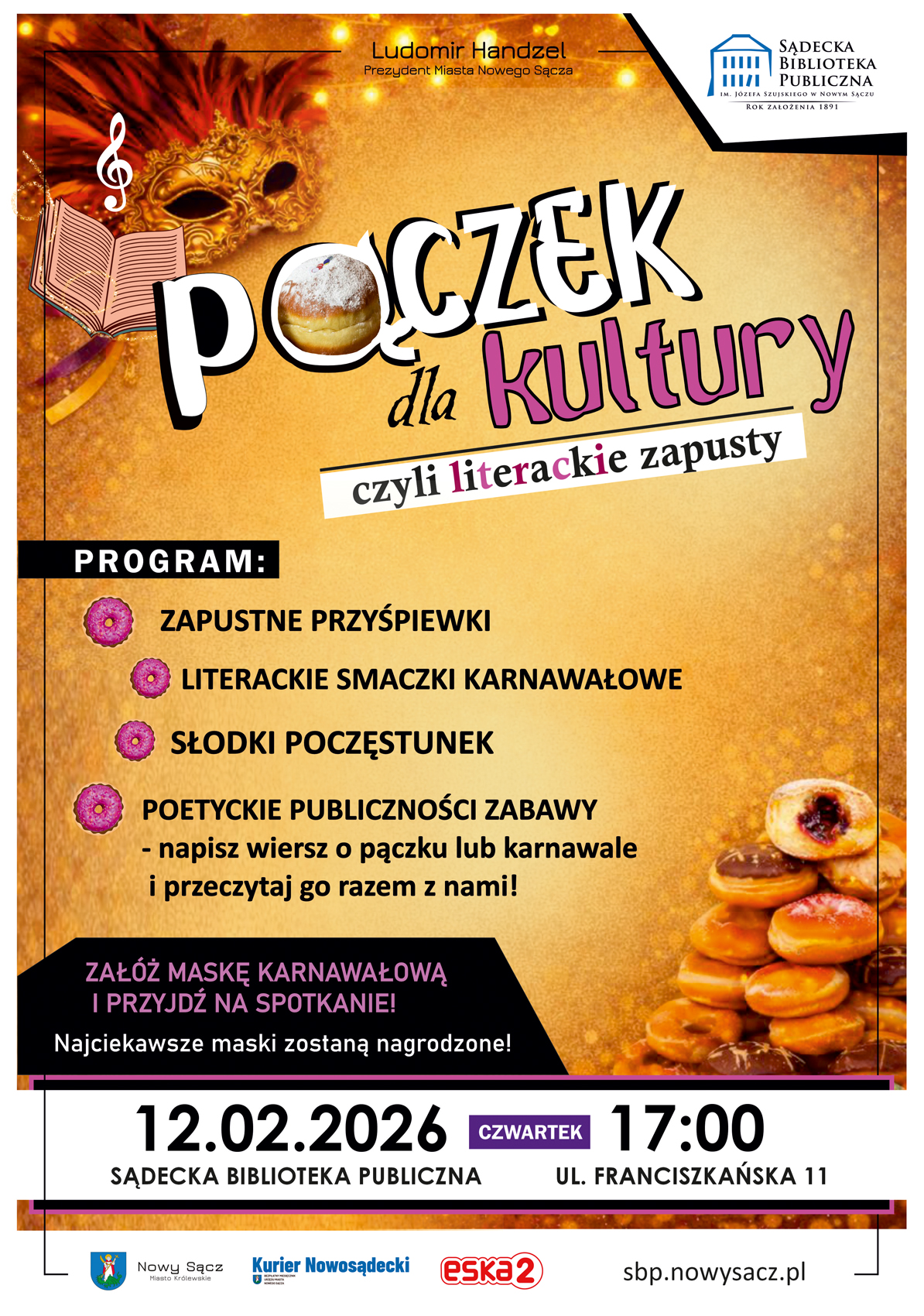 W tłusty czwartek – 12 lutego 2026r. o godzinie 17:00 czytelnia biblioteki głównej (poziom +1, ul. Franciszkańska 11) ponownie wypełni się zapachem pączków, dźwiękiem śpiewu i literacką energią uczestników. To właśnie tu, w nastrojowej przestrzeni odbędzie się biesiadne spotkanie z poezją, muzyką i wspólną zabawą.