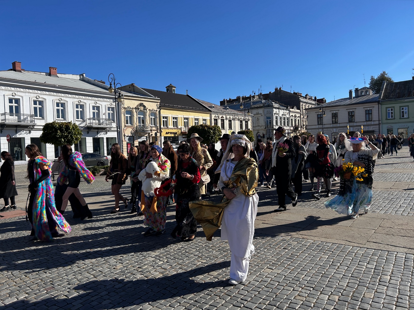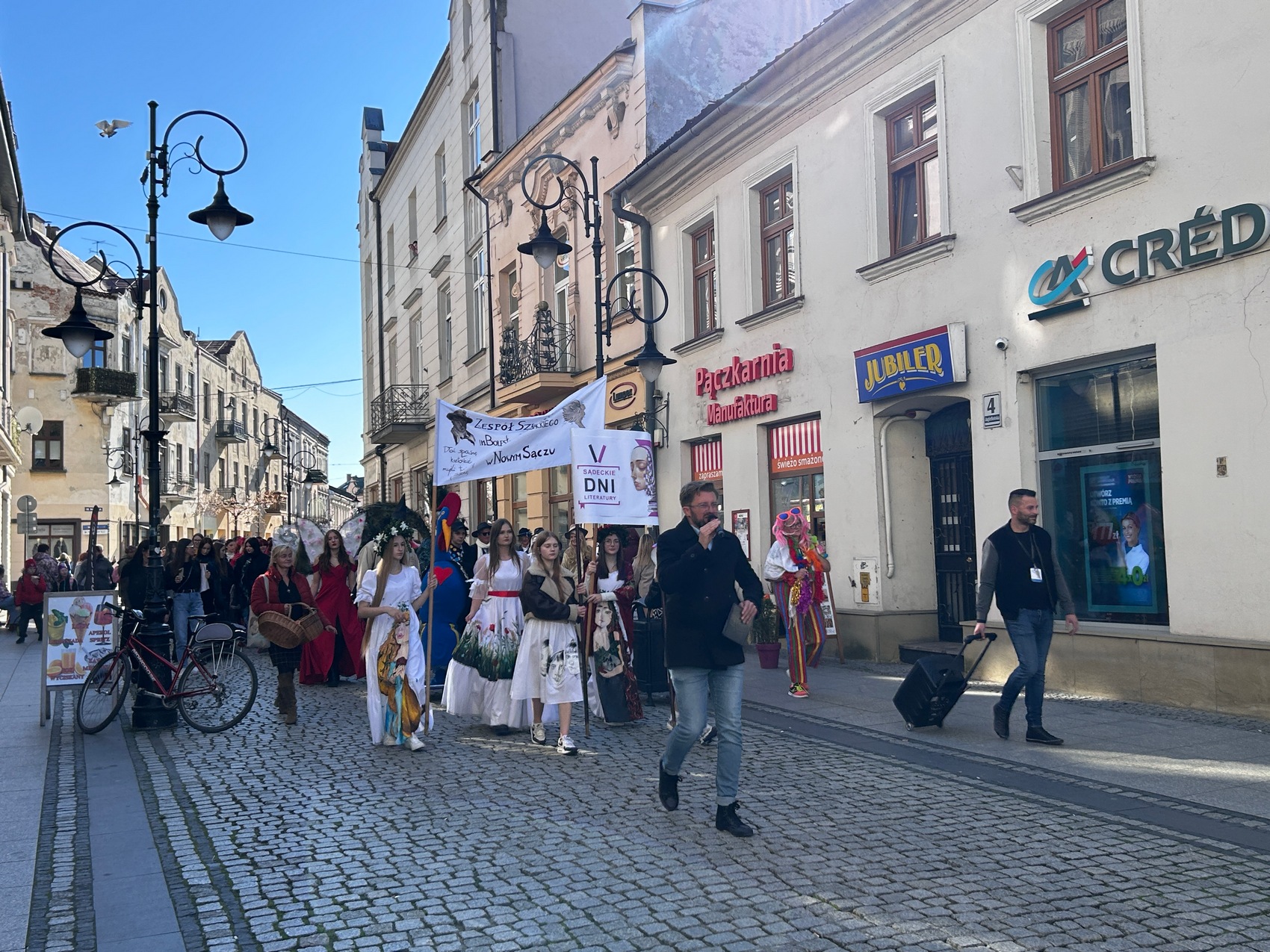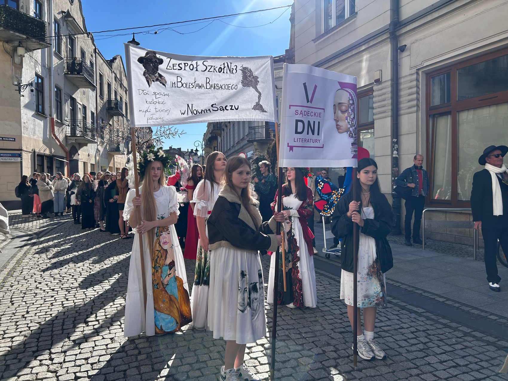 17 października 2024 r. ulicami Nowego Sącza przemaszerował międzypokoleniowy pochód postaci literackich. W kolorowym literackim korowodzie udział wzięła młodzież oraz seniorzy, którzy wspólnie, przebrani za postaci literackie, głośno czytając i śpiewając promowali literaturę w przestrzeni miejskiej. Kolorowy korowód bohaterów książkowych wyruszył spod Zespołu Szkół Nr 3 im. Bolesława Barbackiego – szkoły, której uczniowie zaangażowali się w wydarzenie szyjąc zaprojektowane przez siebie stroje, przygotowując scenę z „Balladyny” J. Słowackiego oraz pokaz mody literackiej. Po przemaszerowaniu głównymi ulicami Nowego Sącza dotarliśmy pod pod Basztę Kowalską, gdzie odbyły się wydarzenia wieńczące korowód. Na scenie przedstawione zostały scenki rodzajowe w wykonaniu młodzieży oraz seniorów, odbył się pokaz mody niezwykłej przygotowany przez uczniów Technikum Przemysłu Mody oraz głośne czytanie i konkurs na najbardziej kreatywne przebrania. Konferansjerem całego przedsięwzięcia był Krzysztof Witowski.