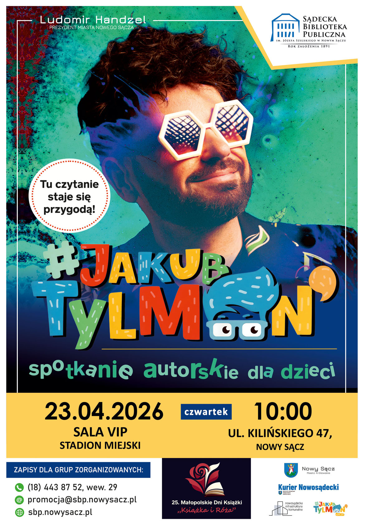 23 kwietnia 2026 r. (czwartek) o godz. 10:00 w Sali VIP Miejskiego Stadionu przy ul. Kilińskiego 47 w Nowym Sączu będziemy gościć Jakuba Tylmana – pedagoga, autora książek dla dzieci, popularyzatora czytelnictwa i jednego z najbardziej inspirujących twórców nowoczesnej edukacji w Polsce.
