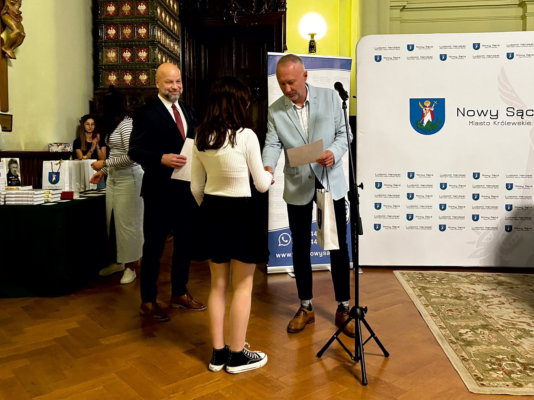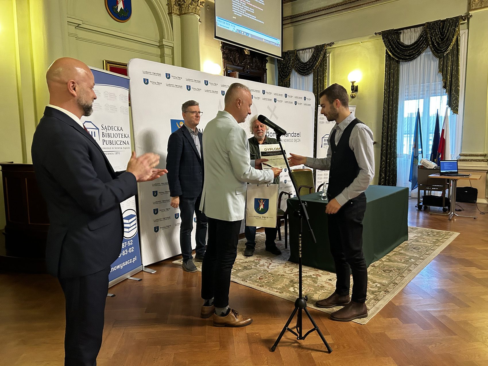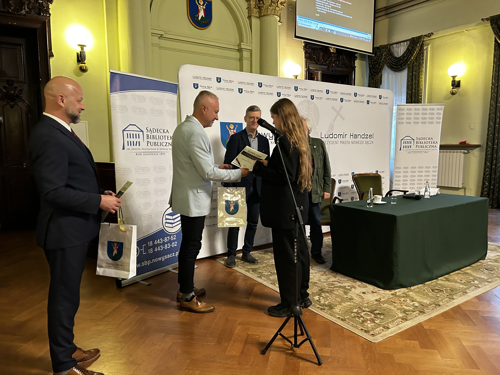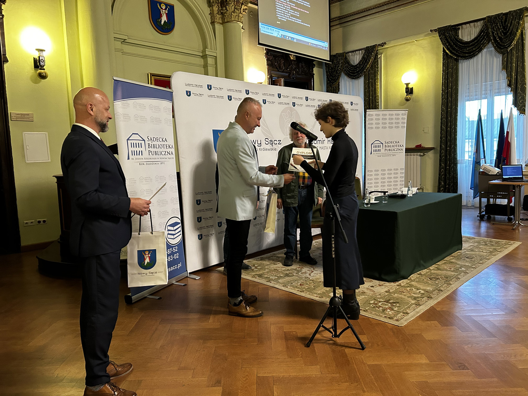 Spotkanie rozpoczęło się oficjalnym ogłoszeniem wyników IV Nowosądeckiego Dyktanda o Pióro Prezydenta Miasta Nowego Sącza Ludomira Handzla w kategoriach: szkoły podstawowe, szkoły średnie oraz open. Ludomir Handzel Prezydent Miasta Nowego Sącza wywołał tegorocznych Mistrzów i Wicemistrzów Ortografii oraz wręczył im nagrody, a Jerzy Illg uściśnął dłoń zwycięzców.
