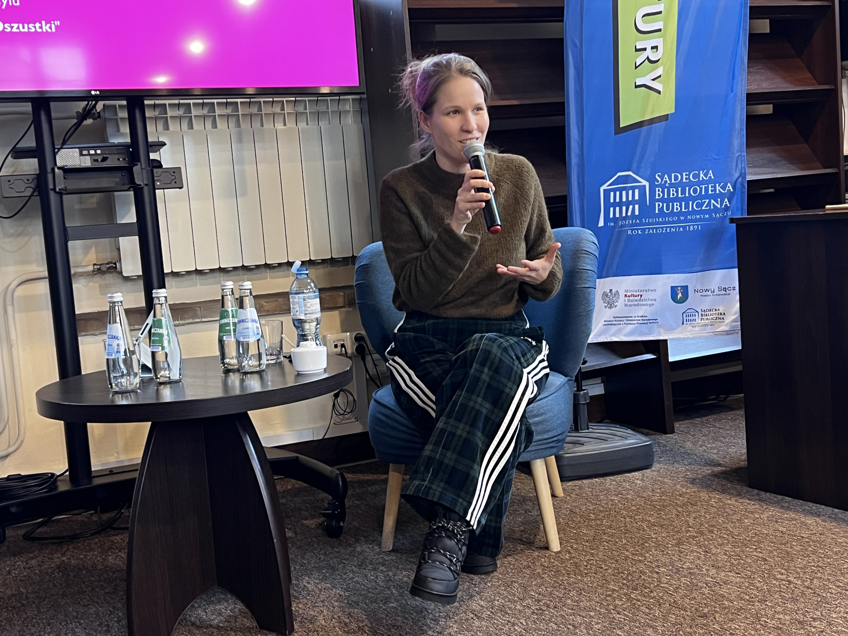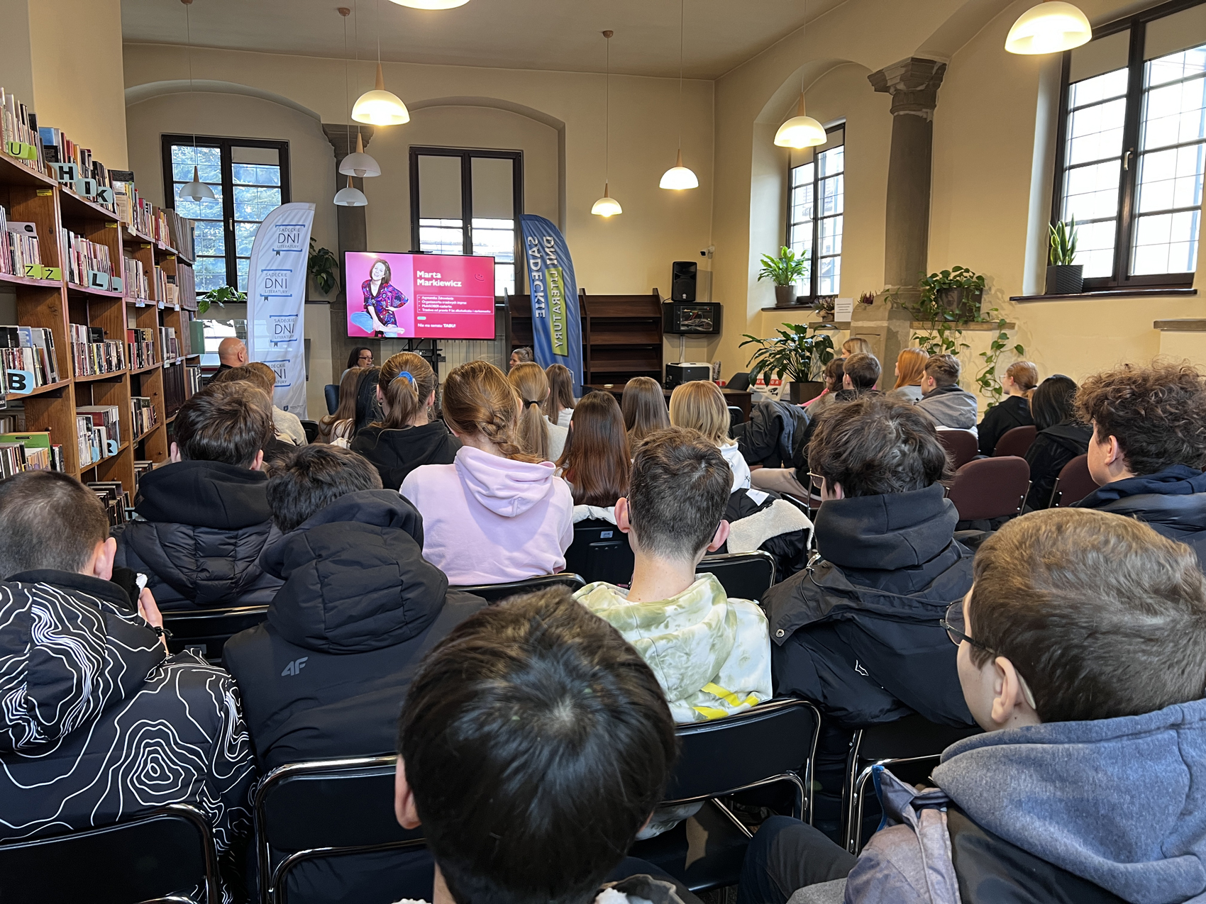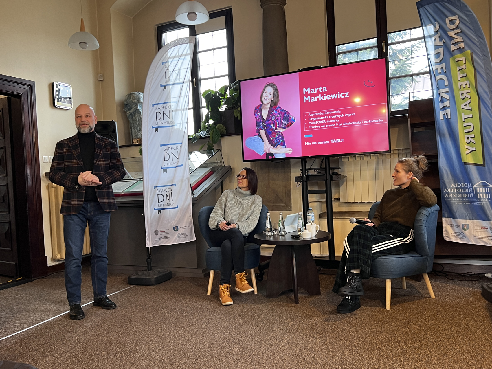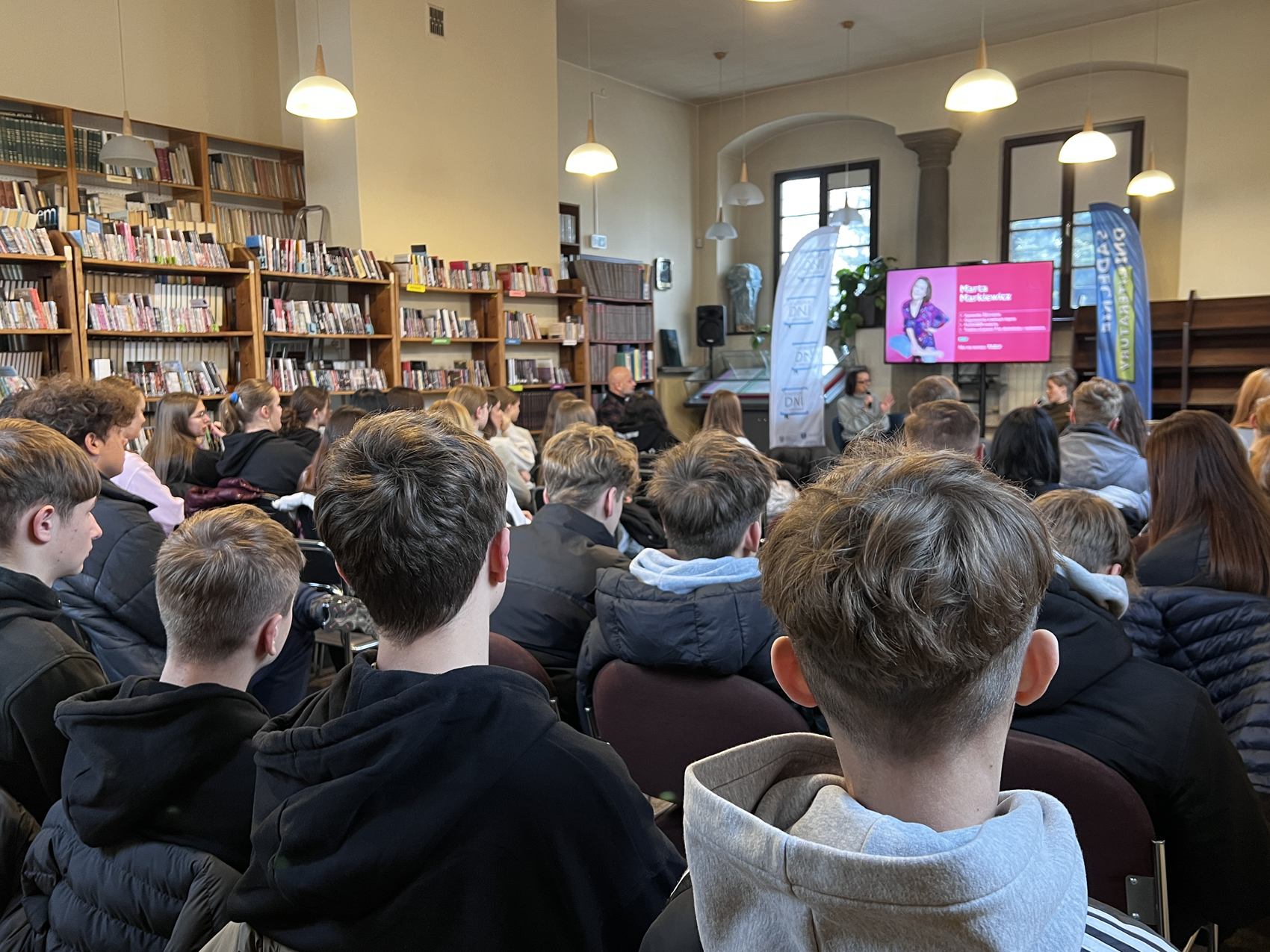28 listopada 2025 r. w czytelni biblioteki głównej odbyło się spotkanie motywacyjne z Martą Markiewicz – autorką książki „Bez alko i dragów jestem nudna”, edukatorką na TikToku (@marta_markiewicz) i Instagramie (@tylkoprestizsieliczy). Rozmowę z autorką prowadziła Alicja Stolarczyk.