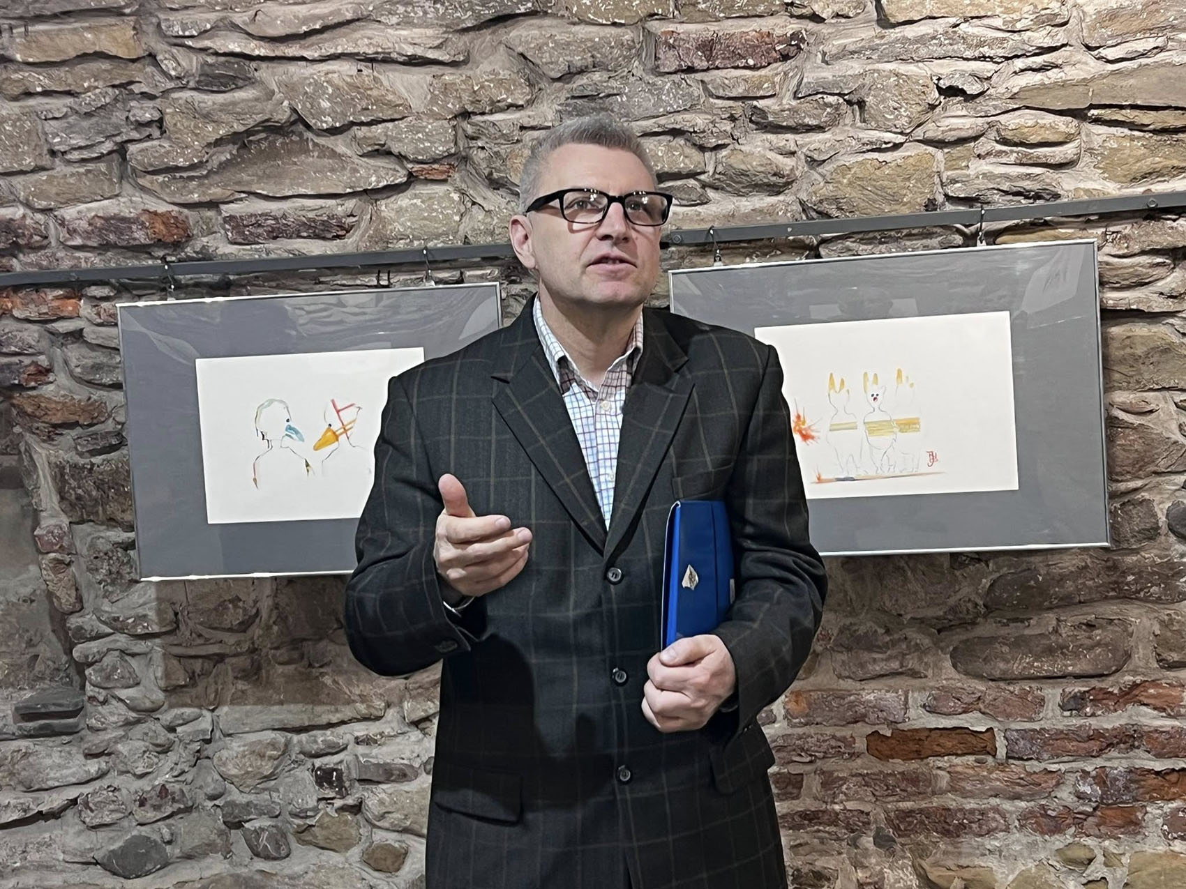 Na wystawie prezentowane są rysunki na papierze, w których dominuje charakterystyczna, rozpoznawalna kreska konturowa. Artysta łączy techniki rysunku i akwareli, tworząc wyjątkowe kompozycje o wyrazistym i unikalnym charakterze.